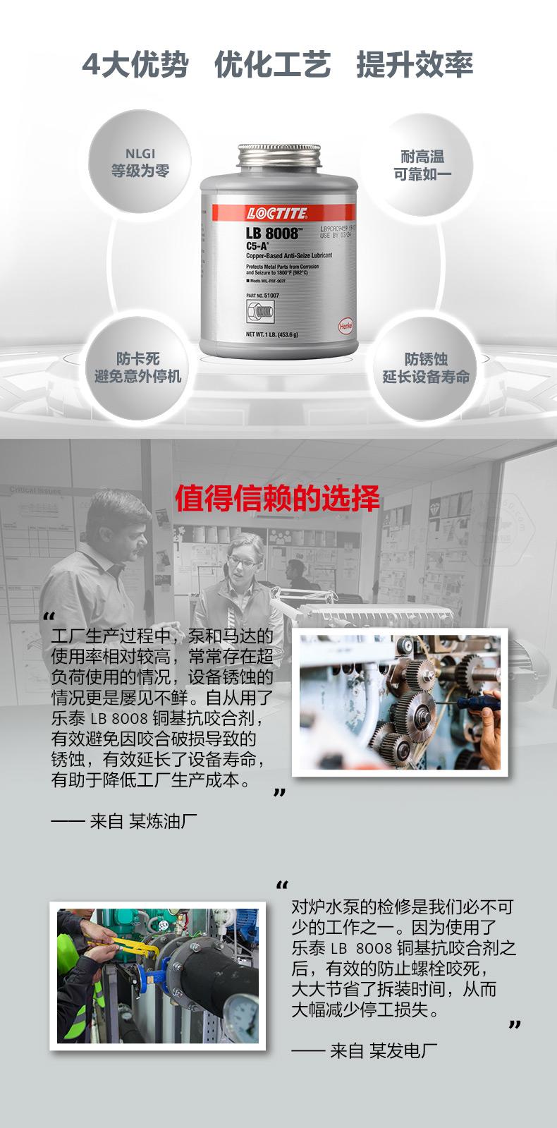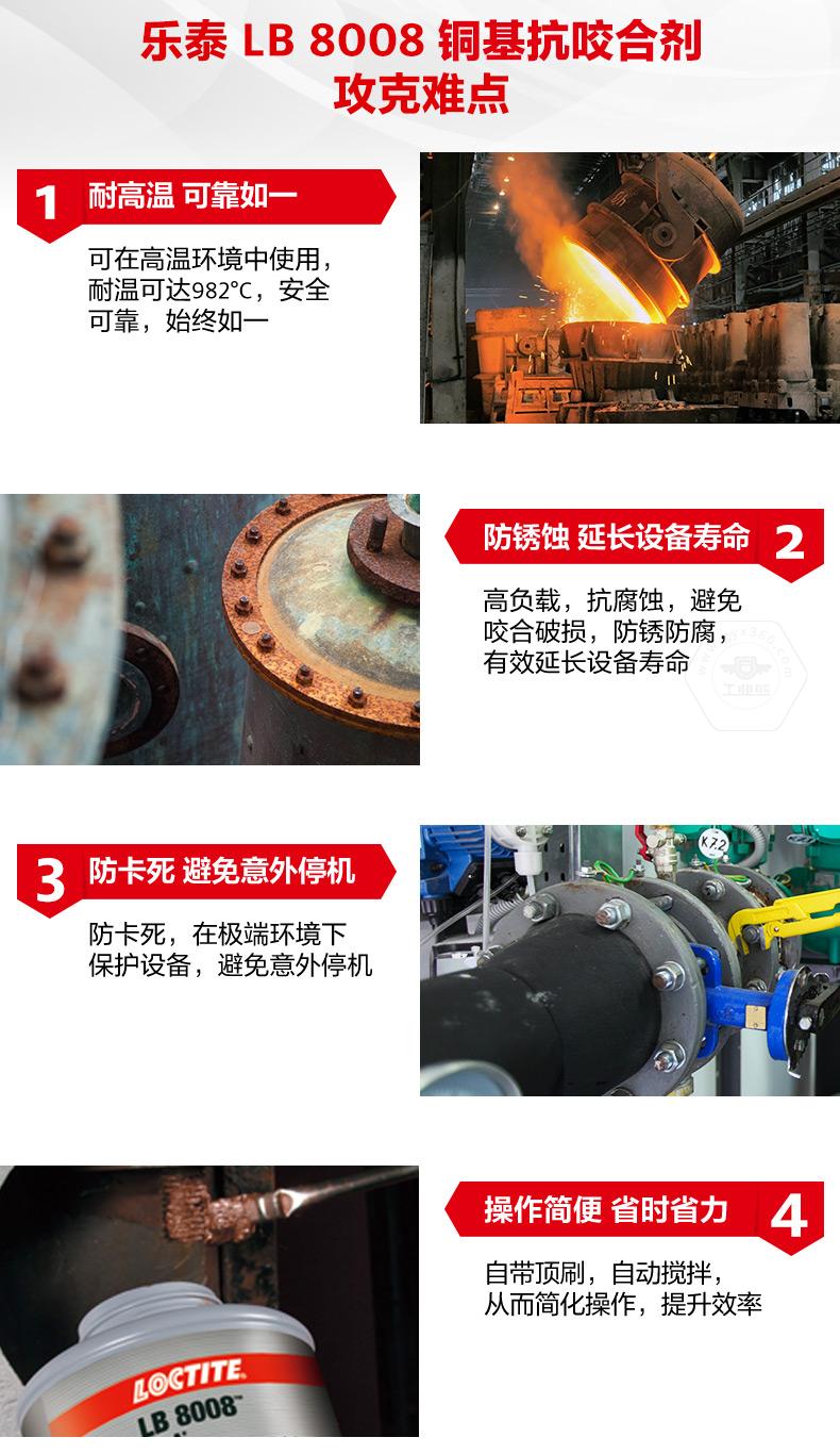 乐泰LB8008铜基抗咬合剂是一款通用型耐高温抗咬合剂。乐泰LB8008铜基抗咬合剂耐温可达982℃,具备防锈蚀、防卡死、NLGI等级为0等特点。乐泰LB8008铜基抗咬合剂适用于高负载和极端环境,可帮助避免咬合破损、延长设备寿命、减少意外停机。乐泰LB8008铜基抗咬合剂自带顶刷并可自动搅拌,操作更简便,适用于采矿、发电、石化、铁路、水处理等行业。