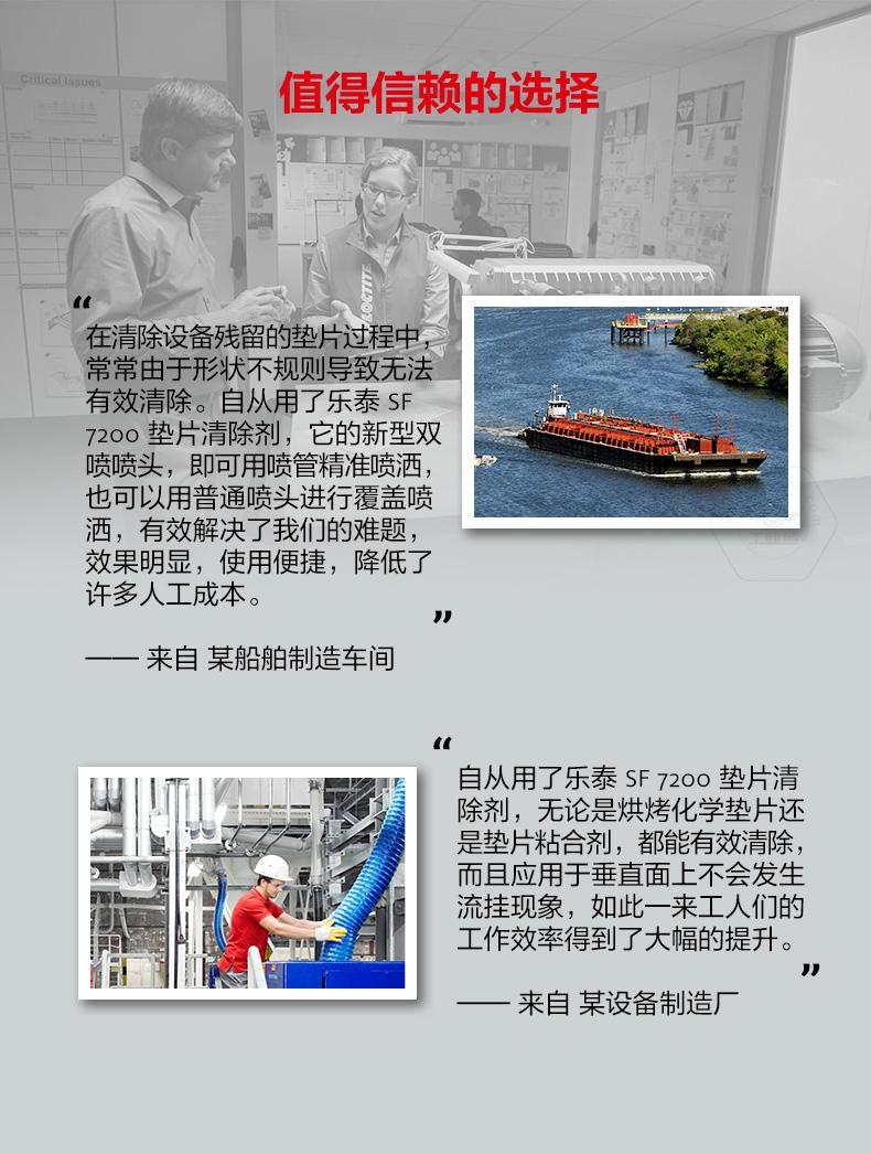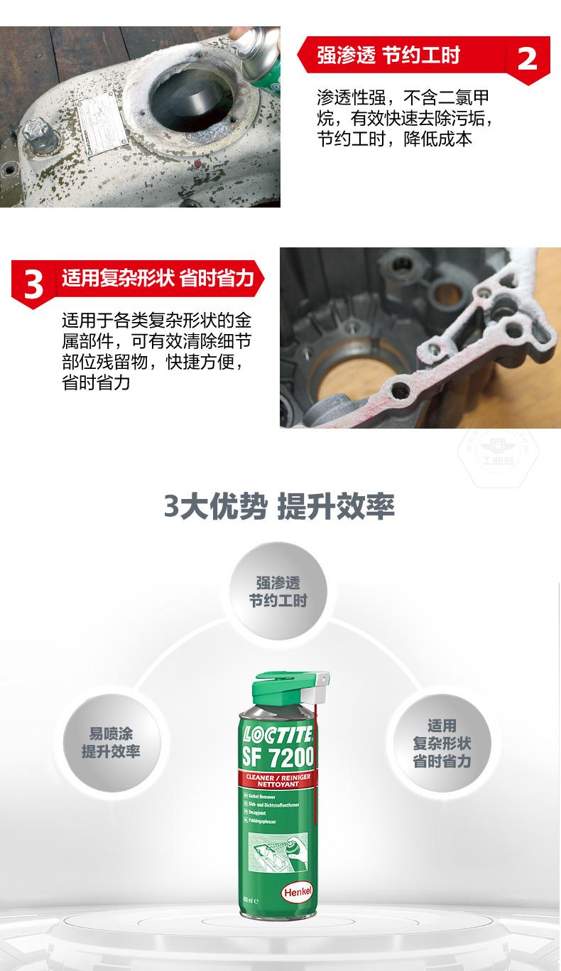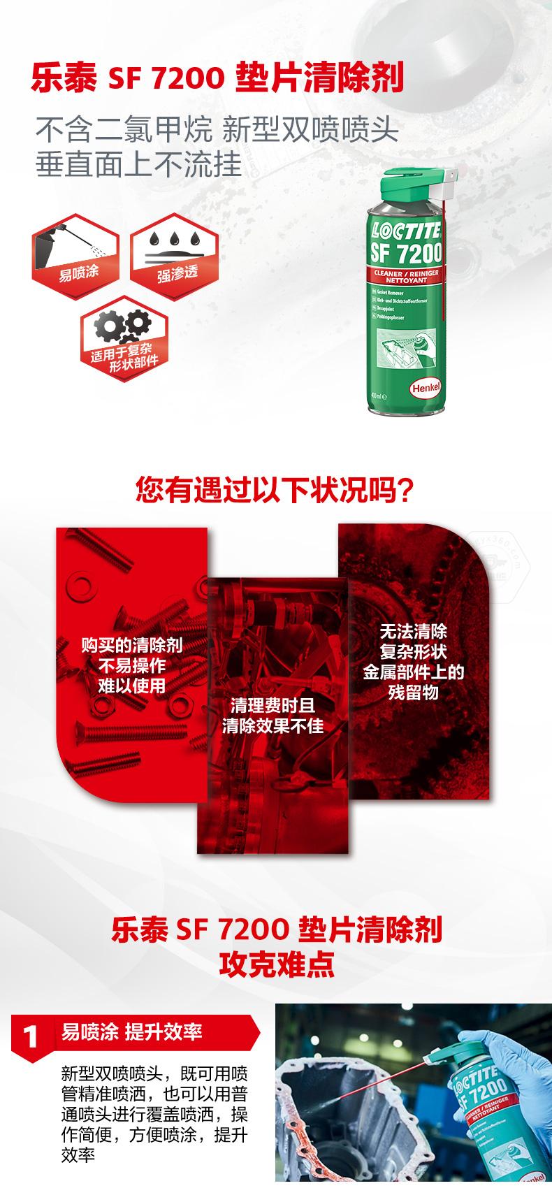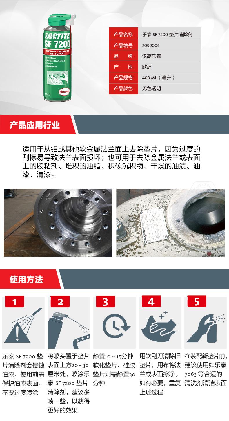 乐泰SF7200垫片清除剂主打易喷涂、强渗透和适用于复杂形状部件。乐泰SF7200垫片清除剂采用新型双喷喷头,既可用喷管精准喷洒,也可用普通喷头覆盖喷洒,垂直面上不流挂,操作更方便。乐泰SF7200垫片清除剂不含二氯甲烷,可快速去除污垢,节约工时,降低成本。乐泰SF7200垫片清除剂适用于从铝或其他软金属法兰面上去除垫片,也可用于清除胶粘剂、油脂、积碳、干燥油漆和清漆残留。