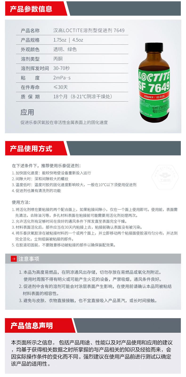 乐泰SF7649是一款用于表面处理、促进固化的溶剂型促进剂。乐泰SF7649适用于惰性金属表面,可促进乐泰厌氧胶在非活性金属表面的固化速度,并兼顾大间隙填充需求。对于需要加快固化速度、间隙较大,或一般在10℃以下使用促进剂的场景,乐泰SF7649更有针对性。乐泰SF7649规格为1.75oz和4.5oz,外观为透明、绿色,溶剂类型为丙酮,溶剂挥发时间30-70秒,粘度2mPa·s,在件寿命≤30天,质保期18个月(8-21℃阴凉干燥处)。